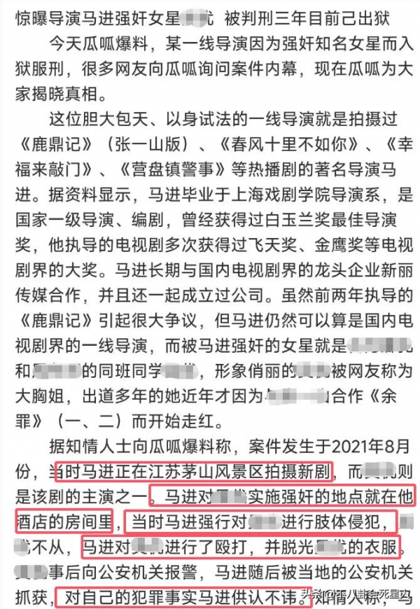 晚上,六点左右,这位狗子正式揭开了谜底,施暴者是国家一级导演兼编剧马进。