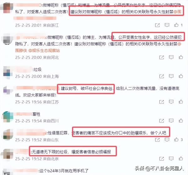网友们也跑到该狗仔社交账号下留言,怒骂对方破坏公序良俗,拿受害者的伤痛博取关注,做法和行为极不道德,应该被"封号"。