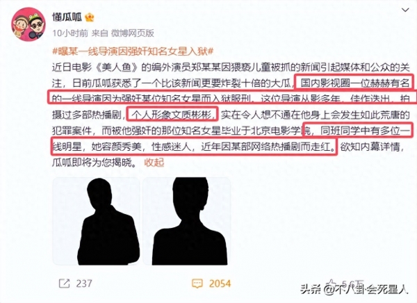 25日上午,某知名狗仔爆料称,圈内有位执导过不少影视作品,获得过白玉兰、飞天奖的导演,因强奸某位知名女星而"锒铛入狱"