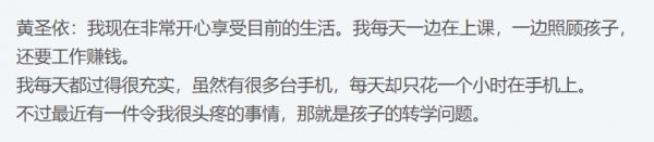 这不,黄圣依被问到最近最头疼的一件事情是什么?而黄圣依也坦言就是孩子从北京转学到上海读书的问题,如今自己的生活很充实又要上课还要工作还要照顾孩子,42岁的黄圣依开始慢慢独立。