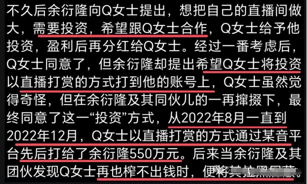 然后余衍隆还同时和其他富婆交往,发现榨取不出剩余价值后就拉黑,金额共涉及800万,被富婆举报后,现在已被抓了。