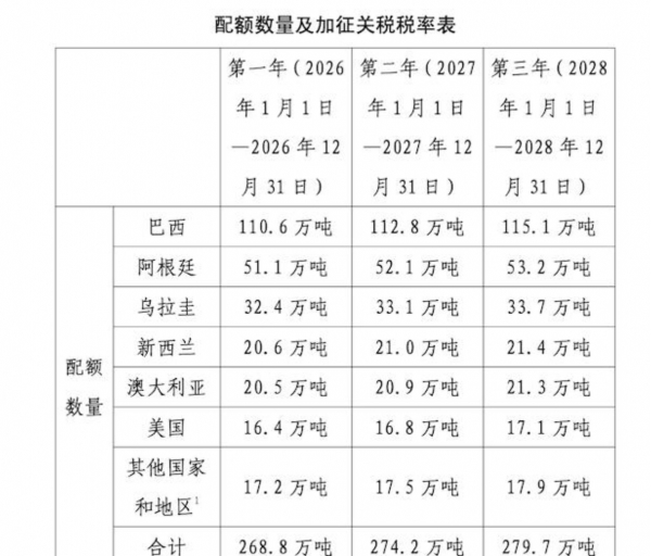 未来的三年里,中国对进口牛肉将不再是敞开大门,而是实行"国别配额"加"关税调节"。简单说,每个国家都有固定的免税或低税额度。以2026年为例,总配额定在270万吨,巴西拿大头,阿根廷、澳大利亚和美国紧随其后。一旦超过这个数,超出的部分就要被加征55%的关税。