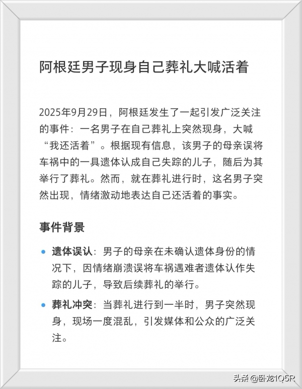 2025年9月的阿根廷,一个22岁的小伙子,因为酗酒,突然消失好几天不见人影。家里人正急得团团转的时候,碰巧另一位长相相似的男子因车祸不幸身亡。小伙子的妈妈看到遗体时,情绪完全崩溃,一口咬定那就是她的儿子。加上当妈的当时已经急昏了头,就这么错认了。