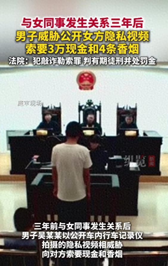 三年前青海格尔木有个男的叫吴某某,跟女同事白某某在车里发生了关系。后来吴某某偷偷用行车记录仪录了视频,一直藏着没发,直到最近开始威胁要公开视频,逼对方给钱和烟。白某某准备了三万块钱和四条烟,按对方说的时间地点见面,当时直接报了警。