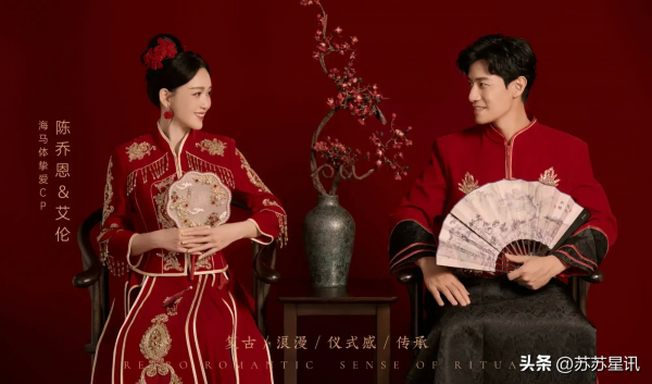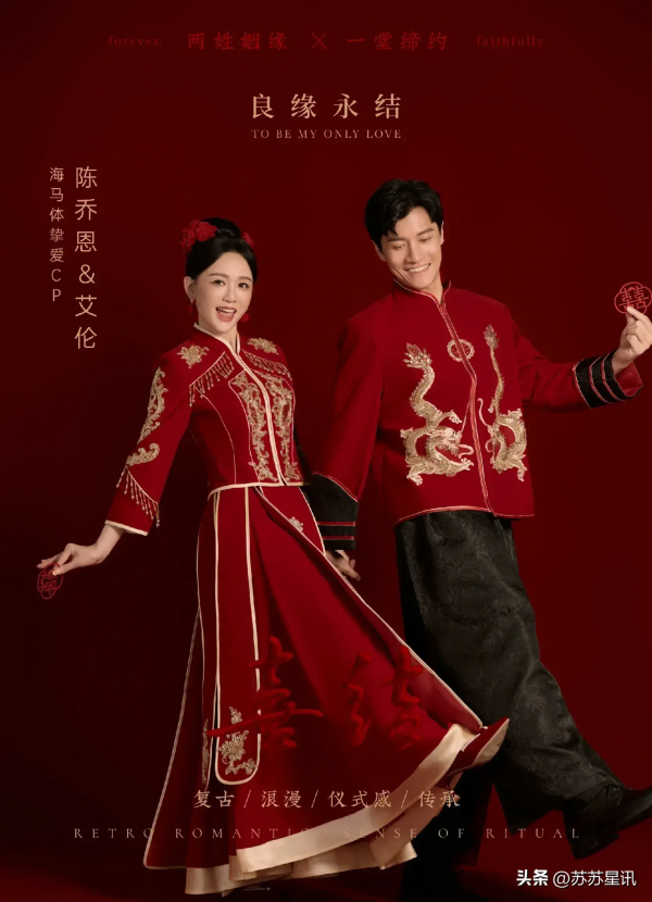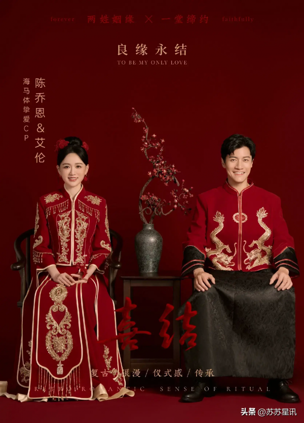 穿上传统的秀禾服,陈乔恩与艾伦的甜蜜对视仿佛穿越了时空,让人不禁想起那句"执子之手,与子偕老"。他们坐在中式椅子上,一个温柔,一个儒雅,完美诠释了"相濡以沫"的深刻含义。
