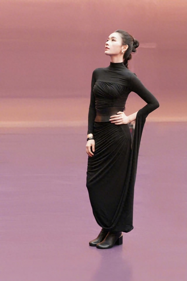 林允穿这条黑裙也太绝了,身材线条完完全全显出来了,腰细、身段软,整个人又瘦又有曲线,盘发干净利落,侧脸精致,又冷又媚,往那一站就特别有气质,又高级又撩人,看着又柔又曼妙,太好看了。