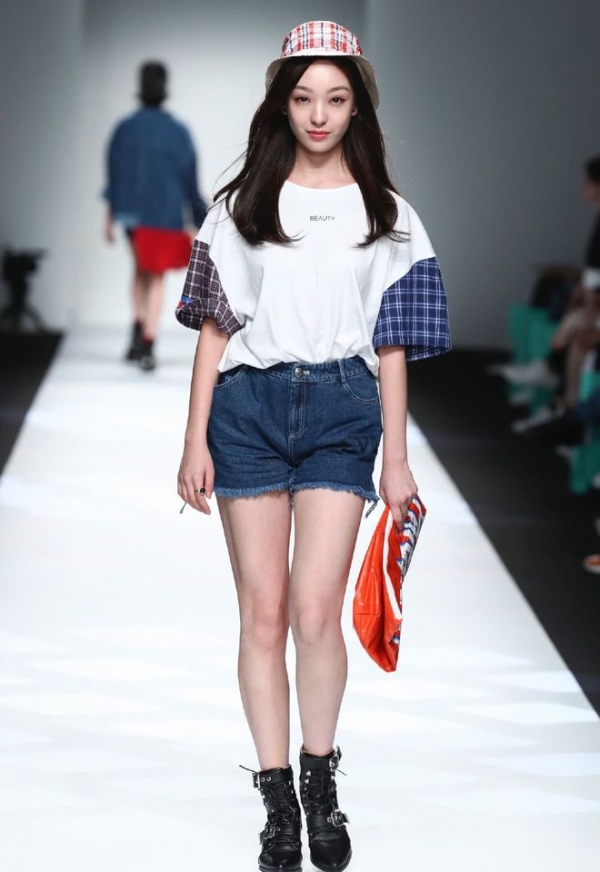这位就是田轩宁了,在秀场上的她很有酷美的风格,身穿的是一件白色的T恤,带着咖色和蓝色的格纹袖子,这样的服装很有时尚感,搭上黑色的靴子,在镜头前的田轩宁戴着一顶格纹帽子,看上去更是很有优雅的气质,整个画风青春的少女范十足。
