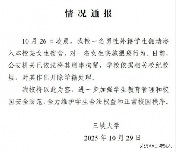 10月29日,也就是事情发生后的第四天,三峡大学发布通报,声称目前公安机关已依法将外籍学生刑事拘留,另外学校依据相关校纪校规,对其作出开除学籍处理。