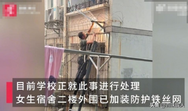 除此之外,学校还对女生宿舍楼进行了改进,二楼外围已加装防护铁丝网。