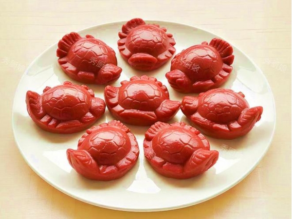 正月初九那一天,在福建台湾地区有吃红龟粿的风俗习惯,红龟粿是一种祭祀用的糯米制成的食物,外形呈圆形,寓意团圆和谐,红色象征大吉大利,龟状,隐喻长命百寿。红龟粿一般是扁平巴掌大小,红龟粿的表皮除了印有花纹外,还会印有吉祥意味的汉字,如代表福运、官禄和长寿的福禄寿等,内里有馅料填充的,吃起来软糯香甜,非常好吃。