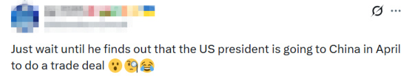 而特朗普的这番"神级变脸"表演,也引来社交平台X上的网友纷纷嘲讽,"这是真疯了。"