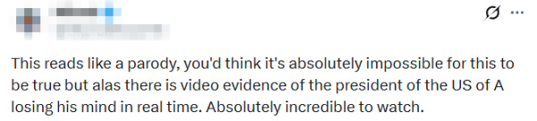 "这事儿听着跟恶搞段子似的,甚至像假的,可偏偏有视频证据,记录下这位美国总统当场失心疯的全过程。这画面,实在太离谱了。"