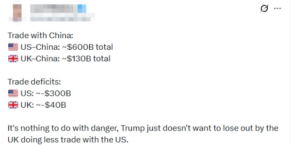 有网友直言,"这根本跟风险没有关系,特朗普只是不想因为英国减少与美国的贸易而蒙受损失。"