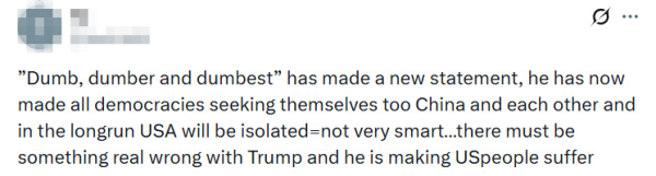 还有美国网友哀叹道,"'无脑、更无脑、最无脑'的家伙又出惊人言论了。他正让所有国家纷纷转向中国、彼此抱团,长远来看美国只会陷入孤立,这实在太不明智了……特朗普的脑子肯定出了大问题,而他的所作所为,正让美国民众跟着遭殃。"