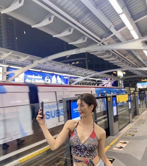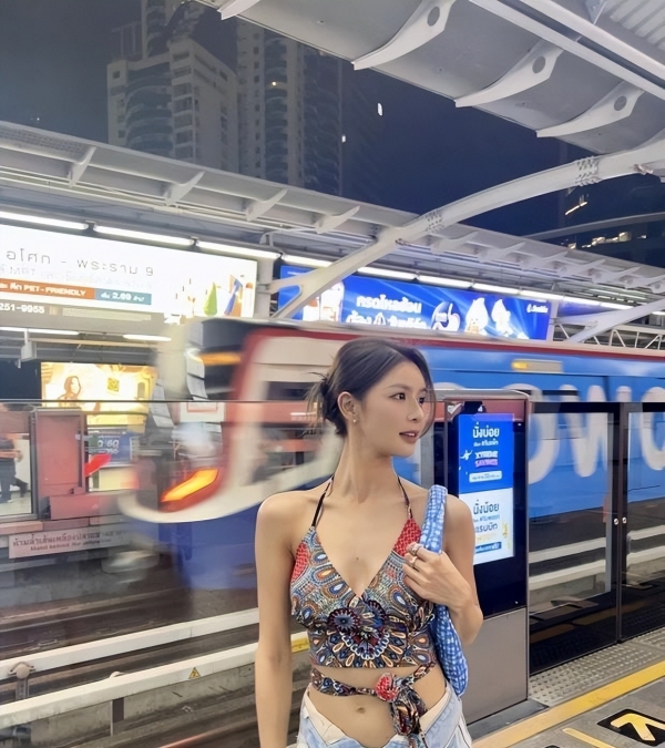 有一张,她在地铁站台立柱旁,手机贴耳,侧脸干净利落,鼻梁挺,唇色亮亮的粉,眼神往远处一飘,那股松弛感,让人忍不住多看两秒。