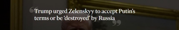 特朗普告诉泽连斯基,乌克兰必须割让整个顿巴斯地区给俄罗斯,否则"乌克兰将面临灭顶之灾""普京将摧毁整个乌克兰"。
