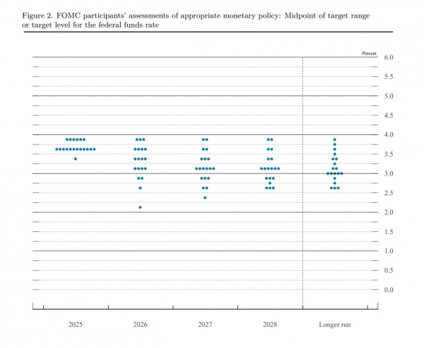 最新发布的点阵图预测显示,多数美联储官员预计2026年和2027年将各有一次25个基点的降息。美联储的中值预测显示,2026年利率为3.4%,2027年为3.1%。有7位美联储官员预计,2026年不会降息。