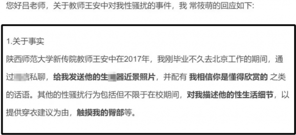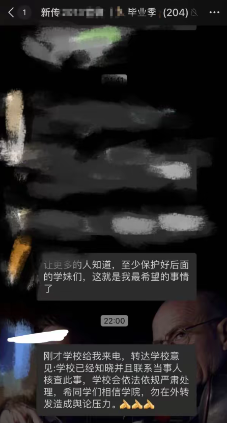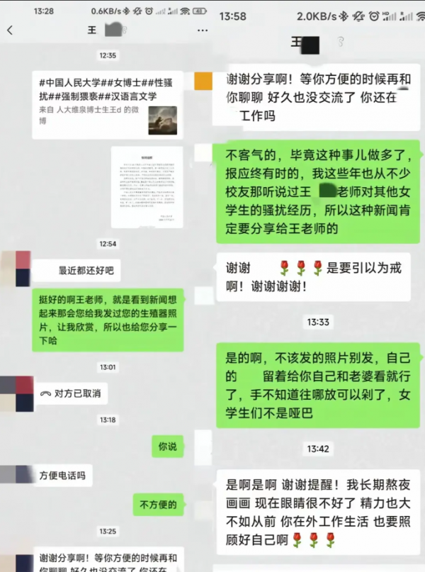 陕西师范大学的一名副教授最近也被指控向女学生发送不雅照片进行骚扰。这位女生受到人民大学事件的影响,才鼓起勇气找到这位教授,并直接质问提醒他。她把这份聊天记录发到了毕业生群里,目的是希望提醒其他同学,让大家警惕,避免受到相似的侵害。
