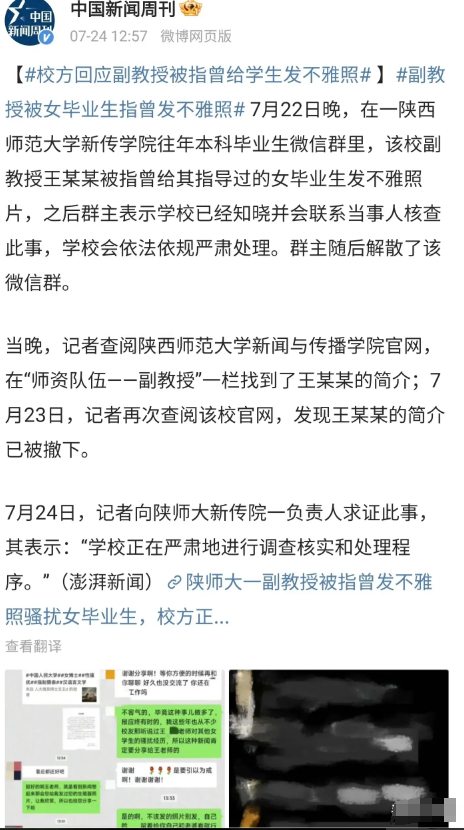 7月24日,陕西师范大学副教授王安中被爆出涉嫌性骚扰丑闻。这位王教授,成了继人民大学的王教授之后,又一个处于舆论风暴中心的大学老师。事件的导火线是,有网友在陕西师范大学新传学院的本科毕业生群里分享了一段聊天记录。