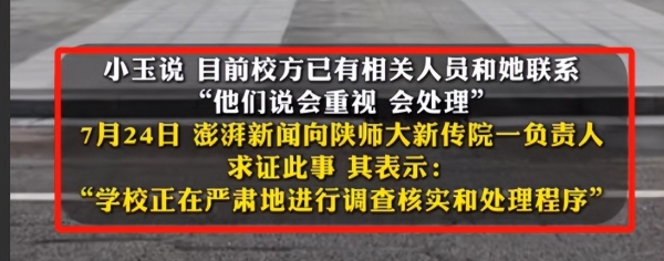 7月23日,澎湃新闻的记者在查阅陕西师范大学新闻与传播学院的官网时发现,原本在"师资队伍--副教授"栏目中的王某某简介已被撤下。这一行动被外界解读为学校对这一事件的初步回应。到了7月24日,当澎湃新闻联系陕师大新传学院的一名负责人核实此事时,对方表示学校正在严肃地进行调查和处理程序。
