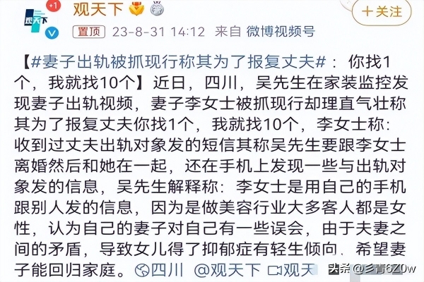 四川一对夫妻之间发生的事,让人哭笑不得。吴氏先生对其妻子的红杏出墙产生了疑虑,为了找到确凿的证据,他偷偷在家里装两个监控,监控视频中果然拍到了妻子与他人行为不轨的画面。然而,令人始料未及的是,当妻子被当场抓获时,她并没有展现出一丝悔意,反而理直气壮地表示这是对吴先生外遇行为的一种报复。李女士自称曾多次劝诫吴先生,可他却从来没有悔改过。李女士对他已经失去信心了,导致自己破罐子破摔了,你出轨我也出轨,你出轨一个我就十个。