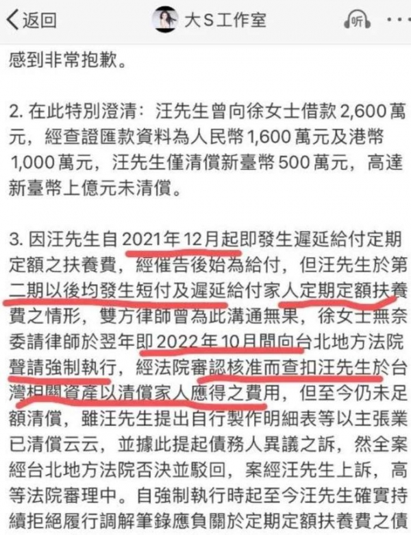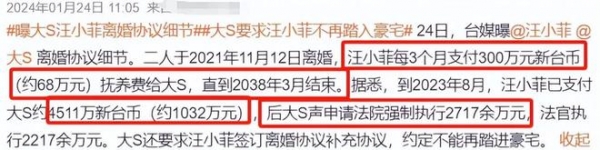 为此,大S没少申请强制执行,要求汪小菲支付抚养费。