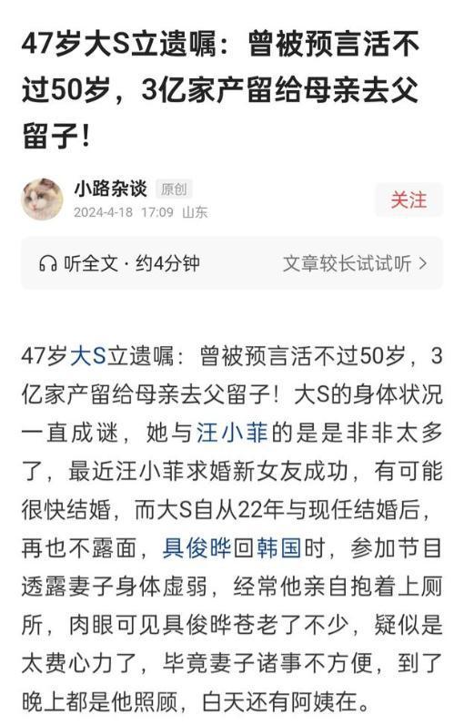 这要取决于大S是否立有遗嘱,毕竟她曾在节目中透露,命理大师断言她活不过50岁。
