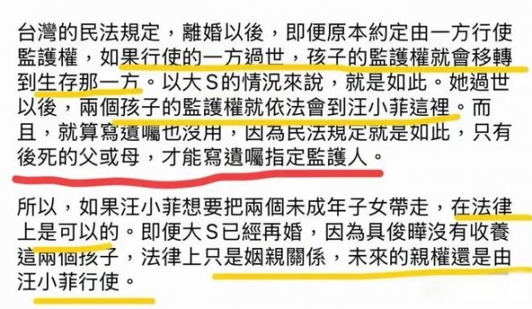大S儿女的抚养权自动转汪小菲,6.5亿遗产或将多数归现任丈夫具俊晔所有!