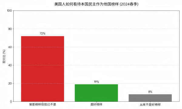 皮尤研究中心(Pew Research Center)2024年的调查数据显示,72% 的美国人认为美国民主"曾是榜样但现在已不是";9% 认为"是好榜样";8% 认为"从来不是好榜样" 制图:观察者网