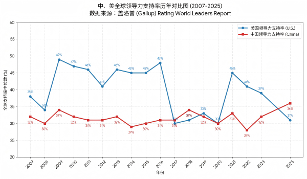 盖洛普民调显示,2025年中国在全球范围内的领导力支持率超过美国,达到了36%。值得注意的是,在特朗普的两个任期内,美国的全球领导力支持率均出现大幅下滑 制图:观察者网