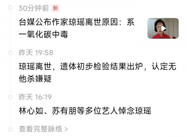 3日晚还与妻子及母亲一起吃饭,4日下午一点秘书进门时,发现琼瑶坐在房间沙发上已轻生离世,桌上留有遗书。