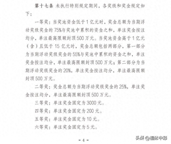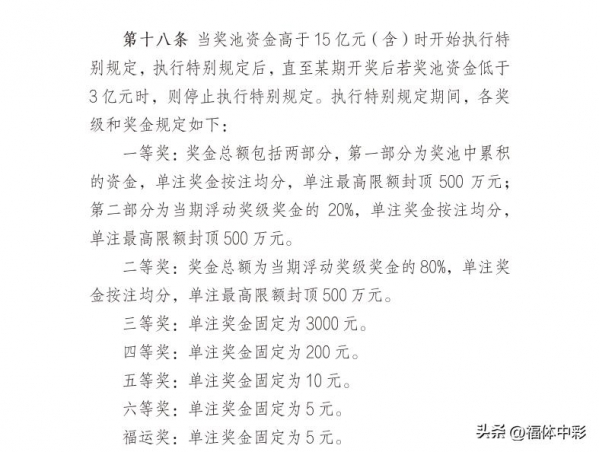 新规: 奖池<1 亿:一等奖占 75%+ 奖池,二等奖占 25%,单注封顶 500 万; 1 亿≤奖池<15 亿:一等奖分两部分(55%+ 奖池 + 20% 浮动奖),二等奖仍占 25%; 奖池≥15 亿(特别规定期):一等奖拿奖池 + 20% 浮动奖,二等奖直接独享 80% 浮动奖,且一等奖总额封顶 1 亿、二等奖封顶 7000 万,超了就按中奖注数均分。