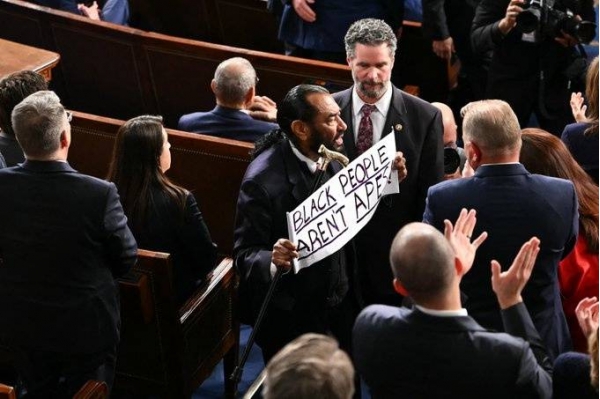 电视直播显示,特朗普开始发表演讲时,格林展开一块横幅,上面写着:"黑人不是猿"。格林随即被带离场。