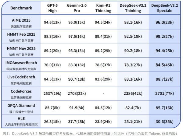 DeepSeek-V3.2及其同类产品的基准测试。截图自DeepSeek技术报告
