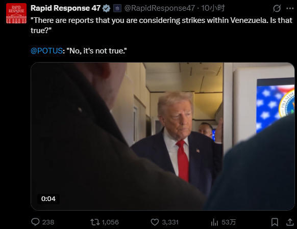 据白宫消息,当地时间31日,有记者询问美国总统特朗普:"有报道称,你们正在考虑对委内瑞拉境内发动袭击。这是真的吗?"特朗普回答说:"不是,这不是真的。"