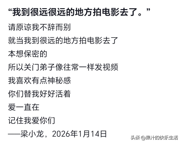 这其中的配文,让网友看了不禁泪目,梁小龙说他喜欢有点神秘感,让大家原谅他的不辞而别,让大家就当他是去了很远的地方拍电影去了!