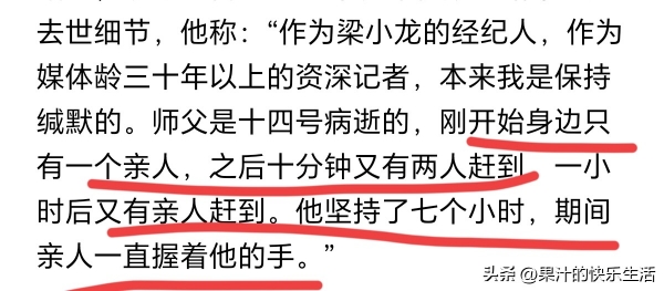 这位经纪人称,师父不喝酒,所以他不是因为喝酒离世的,也不是在睡梦中心梗离世的,他在医院足足坚持了七个小时,他是病逝的!在最后的时刻,梁小龙还喃喃的说,咱们回家吧!