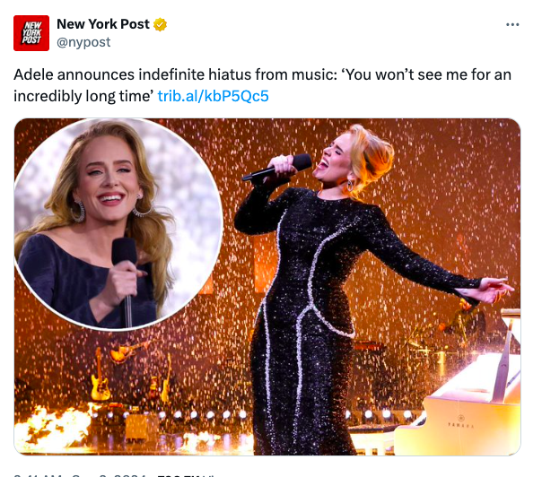 阿黛尔的宣布无疑是整个音乐界的一次重大新闻,她用行动诠释了人生中那些重要的选择。是时候告别过去的身份,迎接一个崭新的自我。不论她在音乐的道路上走得多远,投身于新生活的决心都将引导她走向未知的,但充满希望的未来。