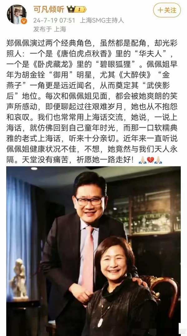 突传噩耗79岁女演员郑佩佩不幸去世,好友曹可凡发文缅怀透露出细节引起热议。