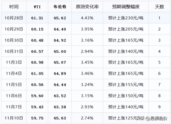 但目前进行的11月首轮油价调整已经重新变涨了。在本轮油价大涨开局的涨幅虽然后续时间连续大降,可惜由于开局涨的太多,导致到今天的本轮油价统计完结时,预期涨幅依然高于50元/吨的调价红线,这让今晚油价将要重新上涨了。