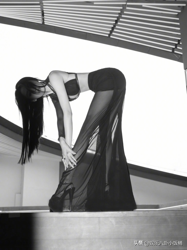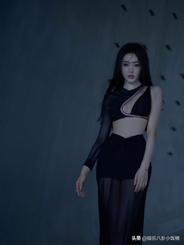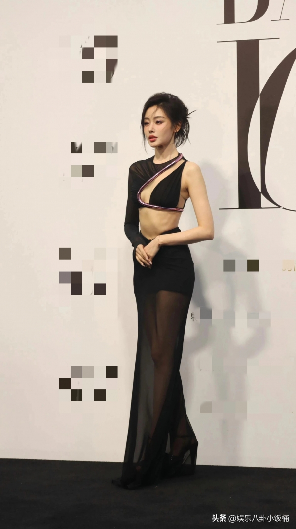 她穿了一身黑纱透网露腰的长裙,隐隐约约能看到黑纱裙中的大长腿。但是,这一身装扮中最让吸引人注意的还是她那纤细凸显肋骨的腰。