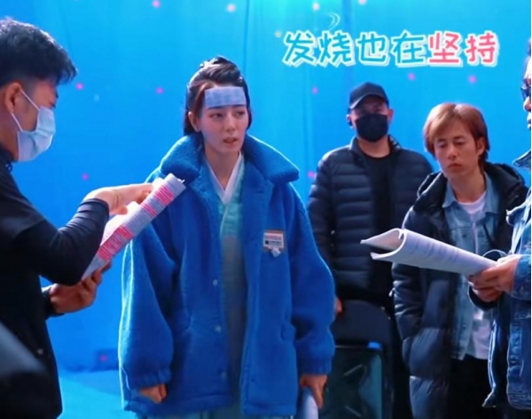 在之前的工作路透照片中,贴着退烧贴工作的迪丽热巴似乎早已习惯了忍耐。