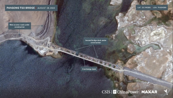 - 第三个重要设施就是班公湖大桥,位于新雷达基地以东约10公里处,距离实控线约23公里。班公湖大桥实际上有两座,第一座较窄的桥梁在去年已经竣工,随后第二座桥梁开始并排修建。2022年3月,CSIS第一次发布了新桥的卫星照片和分析,显示该桥刚刚开工。2022年8月28日的卫星照片显示,该桥的桥面已经与南岸相连,工人正在修建连接大桥两侧的道路。CSIS认为在现有桥面的旁边建造第二个桥面,将扩大通车的流量。不过其他媒体的分析指出,第一座较窄的桥梁很可能是辅助施工的工作桥,正在修建的大桥才是主要桥梁。还有网友指出,班公湖大桥不仅仅是为了连通班公湖南北两岸,方便我军调动兵力,这样想格局小了,班公湖大桥实际上是我国规划中的G695国道的一部分,G695国道将沿着中印边境从北到南贯穿所有对峙地点。