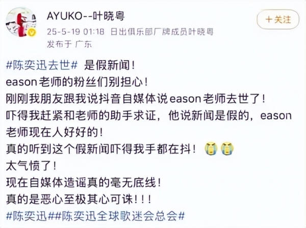 歌手叶晓粤作为陈奕迅之前的队员,听到消息后,赶紧和他的助理取得了联系,这才知道,原来这条消息是假新闻,甚至这件事情还惊动了陈奕迅本人!