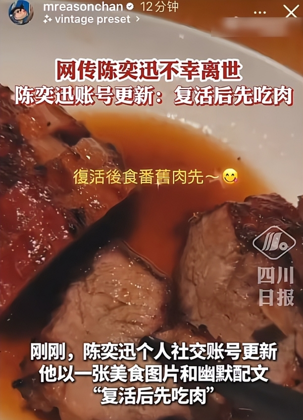随后,陈奕迅也赶紧在社交平台更新动态,还发了一张美食照片,并配文"复活后先吃肉"。