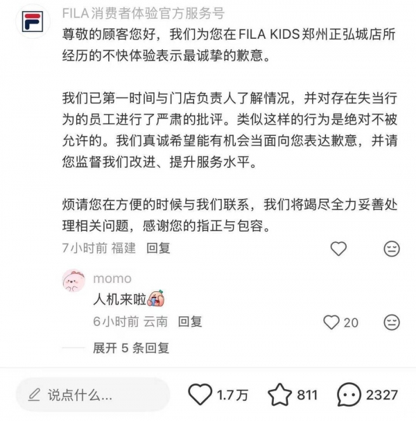 斐乐品牌官方虽未通过官方新闻稿发布声明,但"FILA消费者体验官方服务号"在顾客社交平台评论区留言致歉。