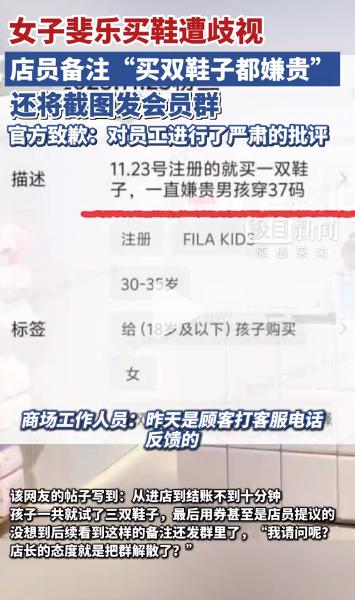 根据《极目新闻》的报道,11月23日,有位网友在社交平台发文,称自己在郑州正弘城五楼FILA KIDS门店为孩子买鞋,却被店员在后台恶意备注。那张截图里,顾客微信名旁赫然写着:"买双鞋子都嫌贵,男孩穿37码"。