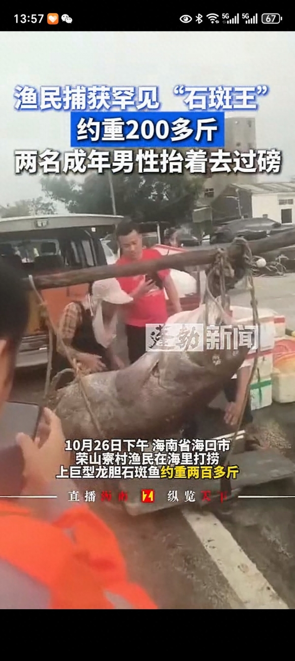 "网里沉甸甸的,拉上来一看魂都惊了!"10月26日,海南海口荣山寮村渔民出海时收获惊喜,一条巨型龙胆石斑鱼被拖上船,体长近1.8米,称重足有200多斤。