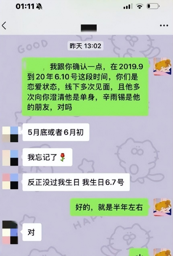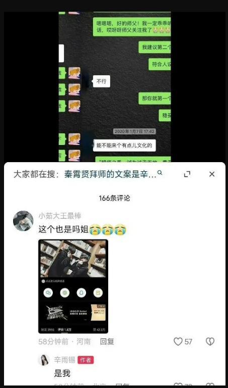 辛雨锡在爆料中称,她和秦霄贤在2018年3月确定恋爱关系。那时候秦霄贤还是个籍籍无名的小演员,辛雨锡不仅在精神上支持他,还在物质上给予了很大帮助。什么豪车、住所,全都是辛雨锡提供的。辛雨锡还自称是秦霄贤的"文案团队",为他撰写日常文案、宠粉日记和拜师文案等。