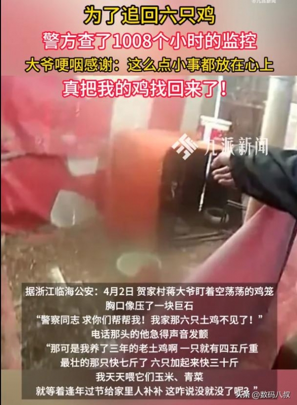 "警察同志,我家 6 只鸡被偷了,那可是我半年的心血啊!" 浙江台州一位蒋大爷焦急报警,6 只土鸡被盗,看似是一起不起眼的 "小案",却牵动着大爷的全部心血。让人没想到的是,当地警方高度重视,组建专班全力侦破,为了找到线索,连续调取、查看了1008 小时监控视频,最终成功抓获两名嫌疑人,将 6 只鸡完好无损地送回大爷手中,这一事件迅速刷屏全网,无数网友为警方点赞,直呼 "这才是人民公安该有的样子"。